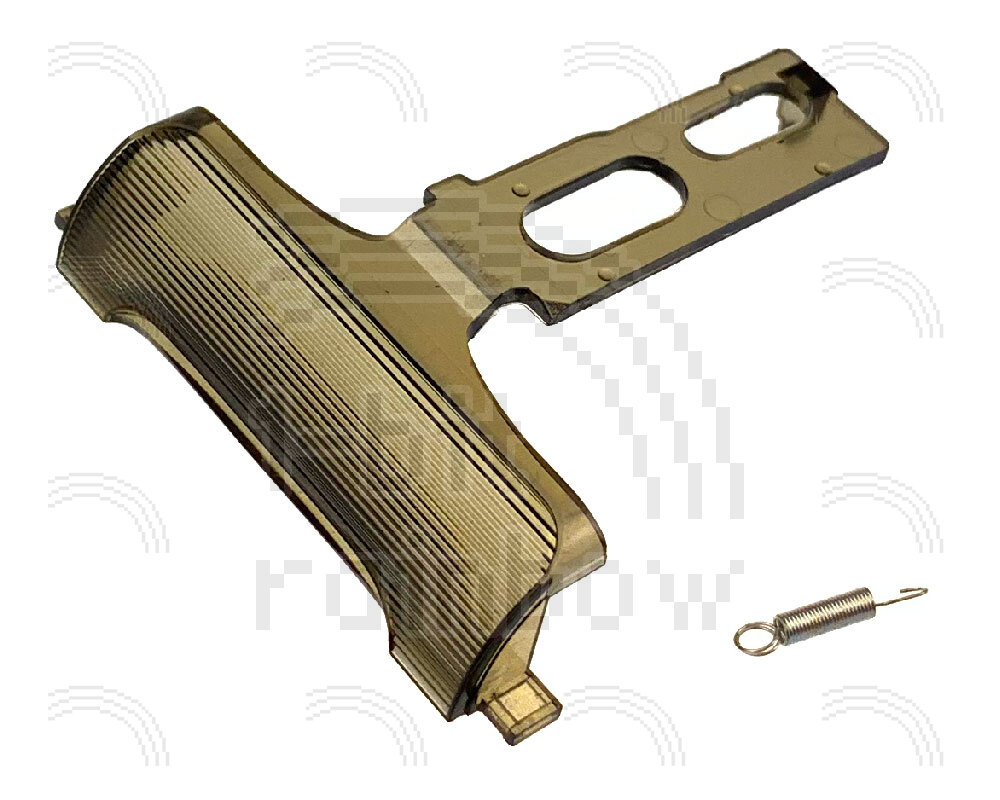Original Apple clear bronze plastic lid release button and spring for the PowerBook G3 Lombard and Pismo ranges. The spring connects the button to the yolk.