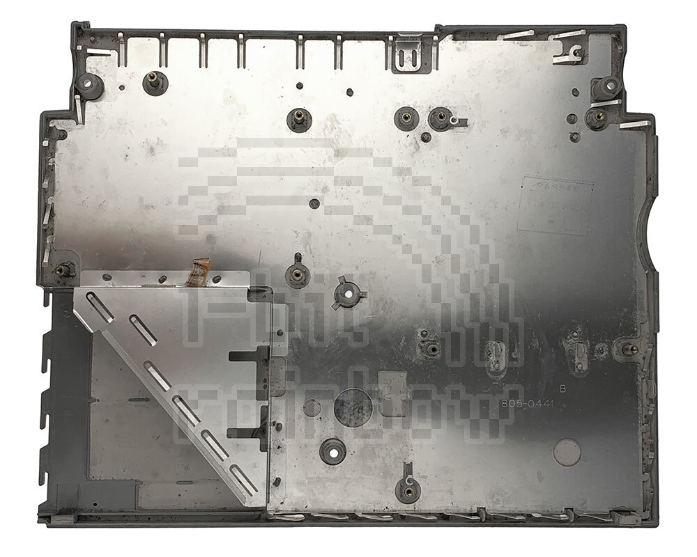Original Apple bottom case with metal chassis and backing sheet for the PowerBook 165. Although this has the PowerBook 165 model label, the bottom case is physically interchangeable with the PowerBook 160, 165c, 180 and 180c.