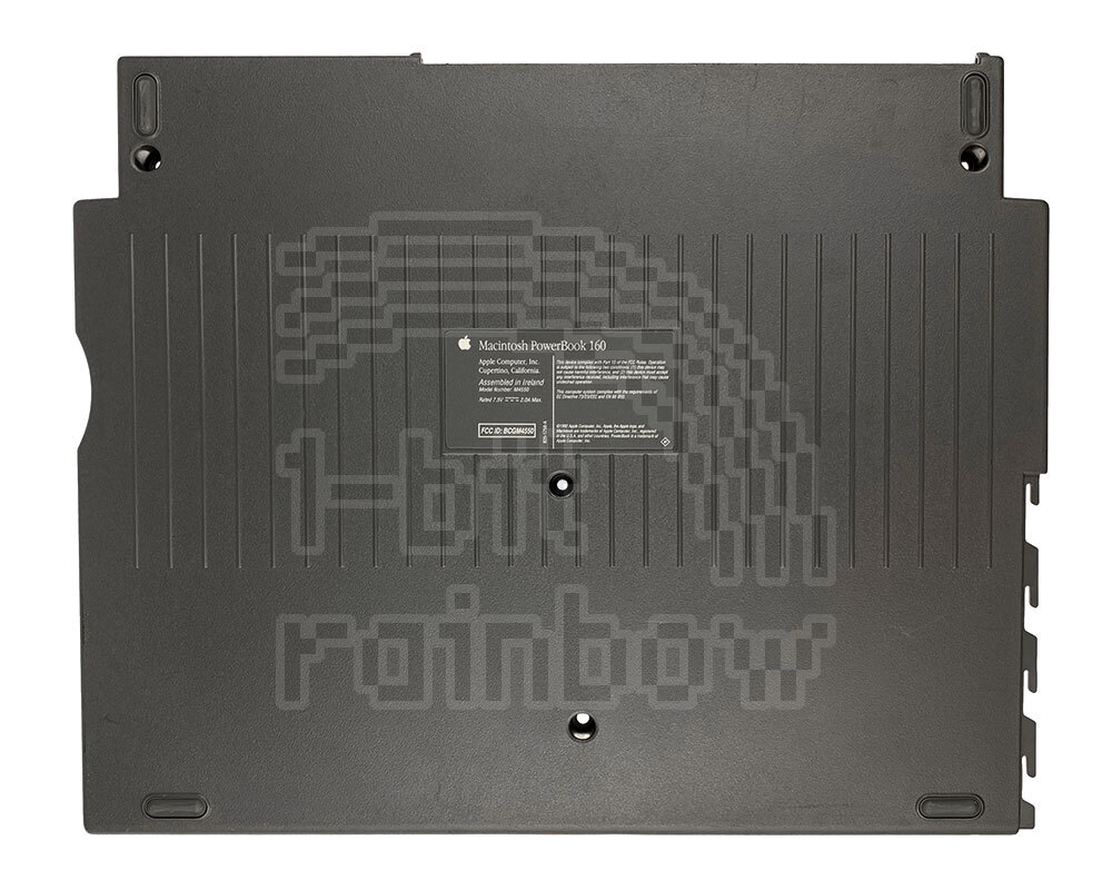 Original Apple bottom case with metal chassis and backing sheet for the PowerBook 160. Although this has the PowerBook 160 model label, the bottom case is physically interchangeable with the PowerBook 165, 165c, 180 and 180c.