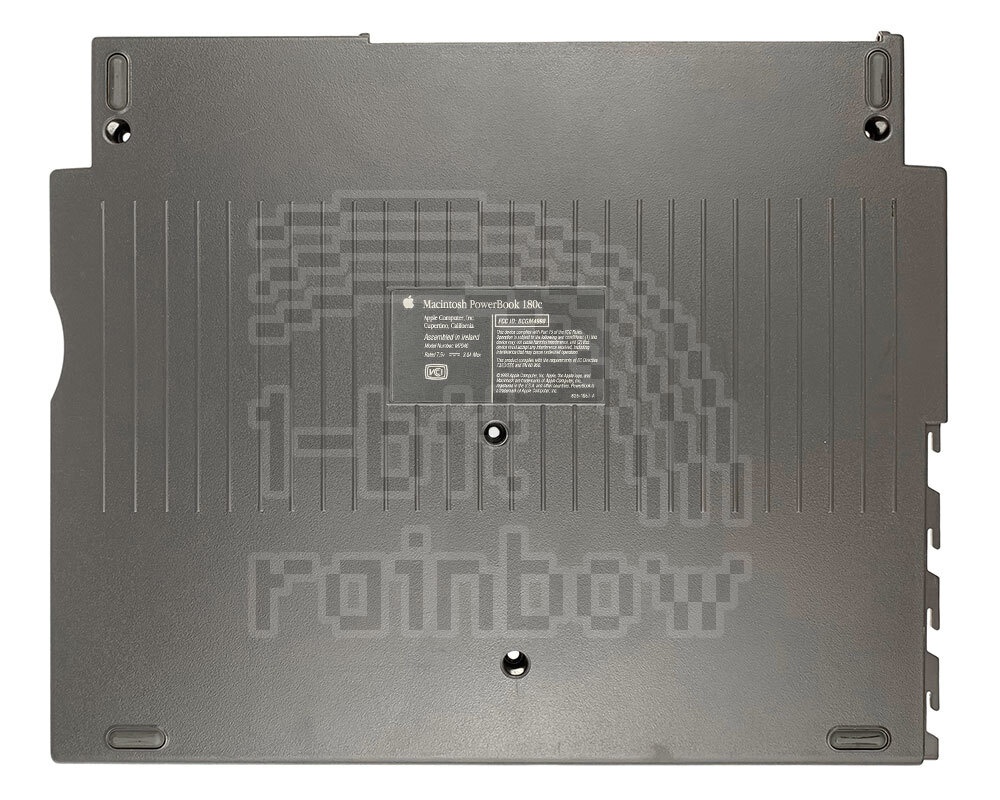 Original Apple bottom case with metal chassis and backing sheet for the PowerBook 180c. Although this has the PowerBook 180c model label, the bottom case is physically interchangeable with the PowerBook 160, 165, 165c and 180.