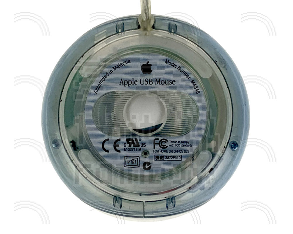 Original Apple, fully tested and deep cleaned, Graphite (grey) 'hockey puck' USB mouse that shipped with the graphite and snow iMac G3 models. All graphite models came with the indentation in the button to help overcome the problem of the mouse rotating during use. It has a 60cm cable and one button, although it will function on any computer with USB.